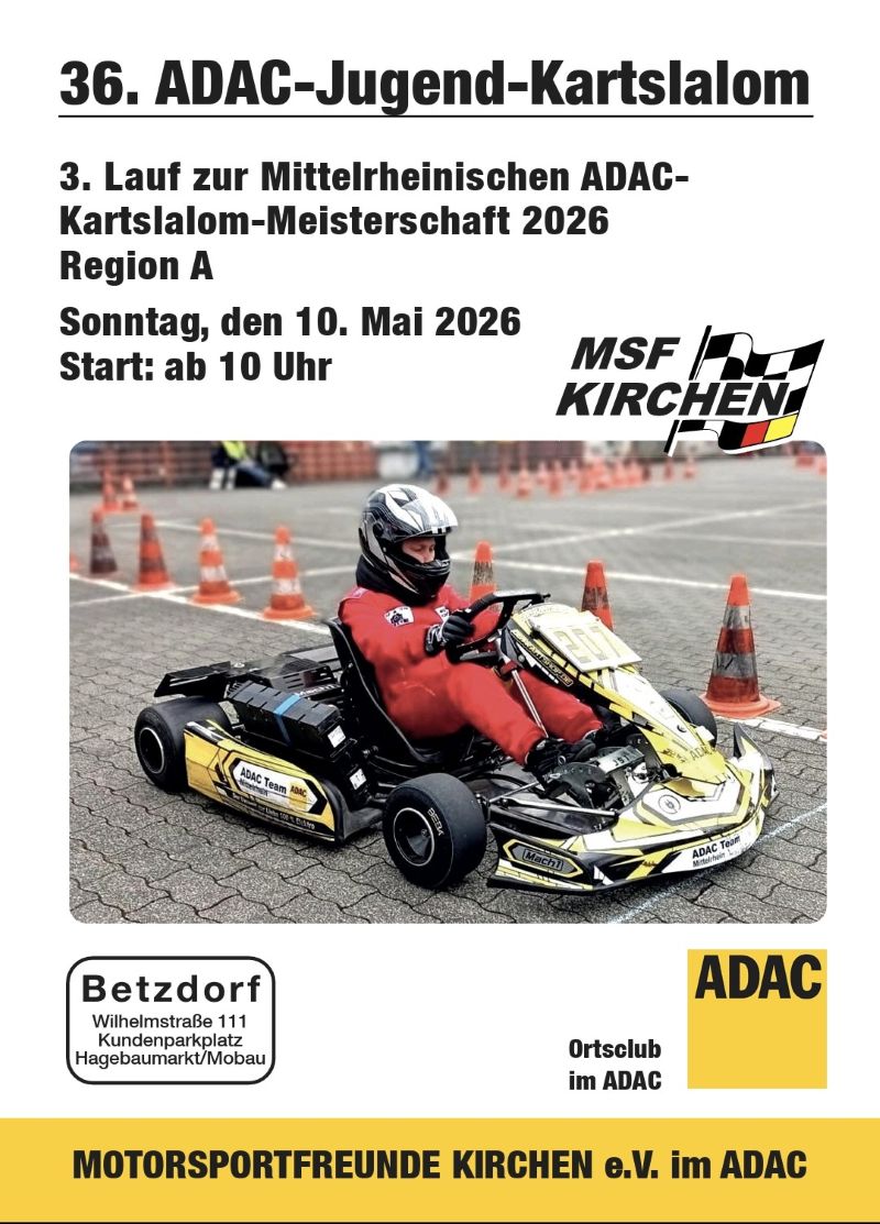 Der 35. ADAC- Kartslalom wurde am 4. Mai auf dem Parkplatz der Fa. Mobau u. Hagebaumarkt in Betzdorf ausgetragen. Im letzten Jahr gingen 155 Starter(innen) an den Start, 7 davon aus unserem Verein. Viele Helfer waren wieder dabei und haben durch ihren Einsatz, zum Gelingen dieser Veranstaltung beigetragen.